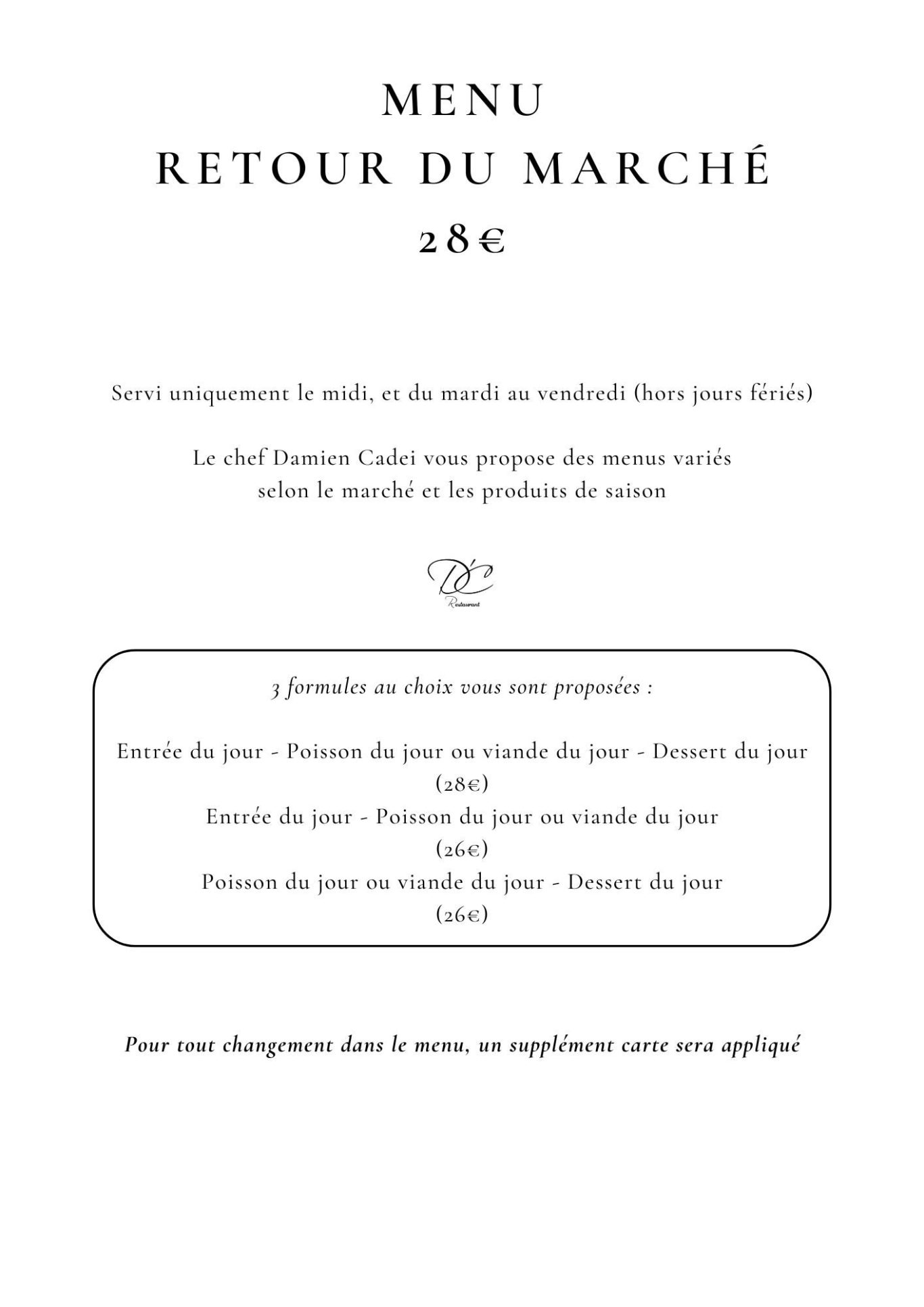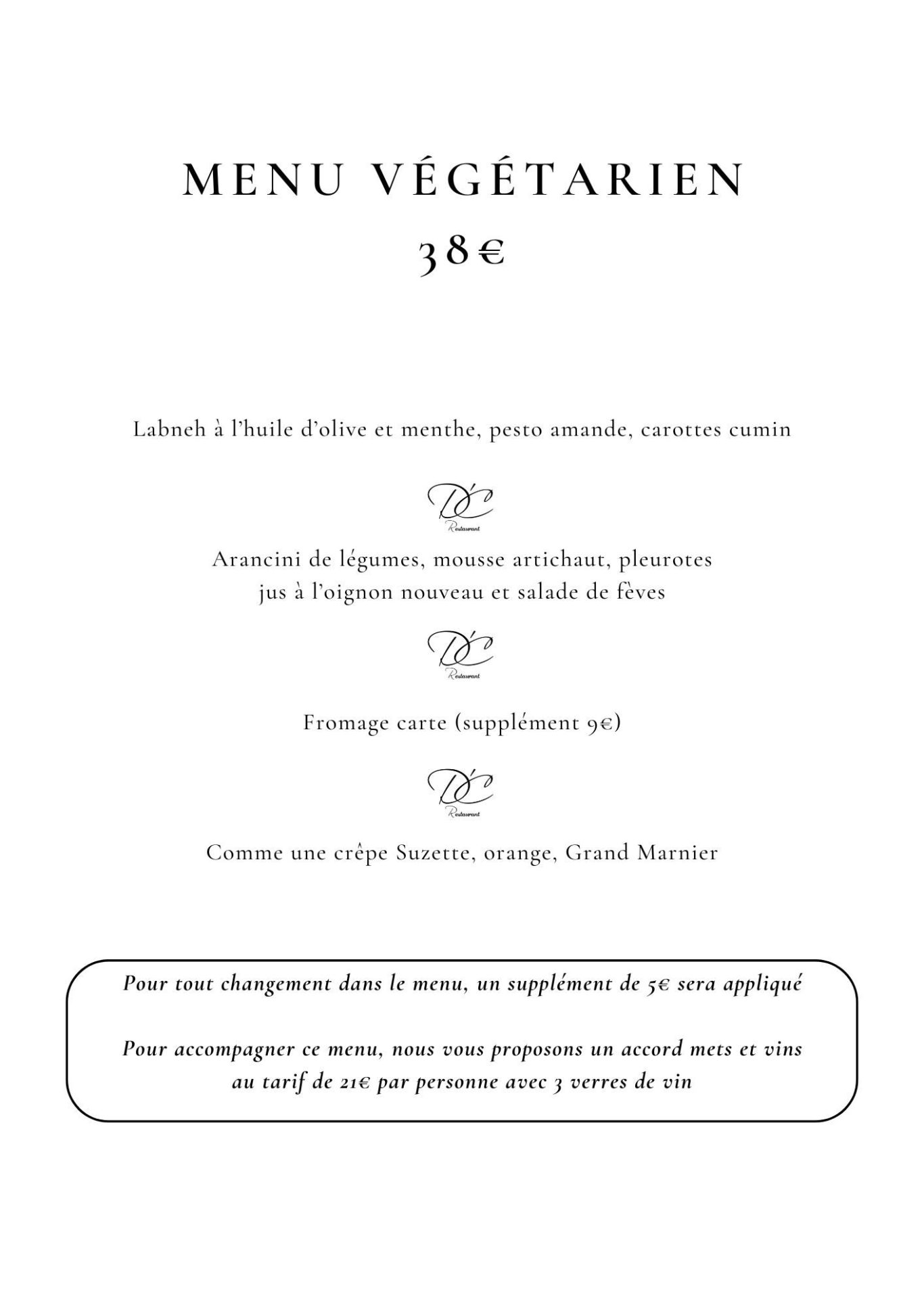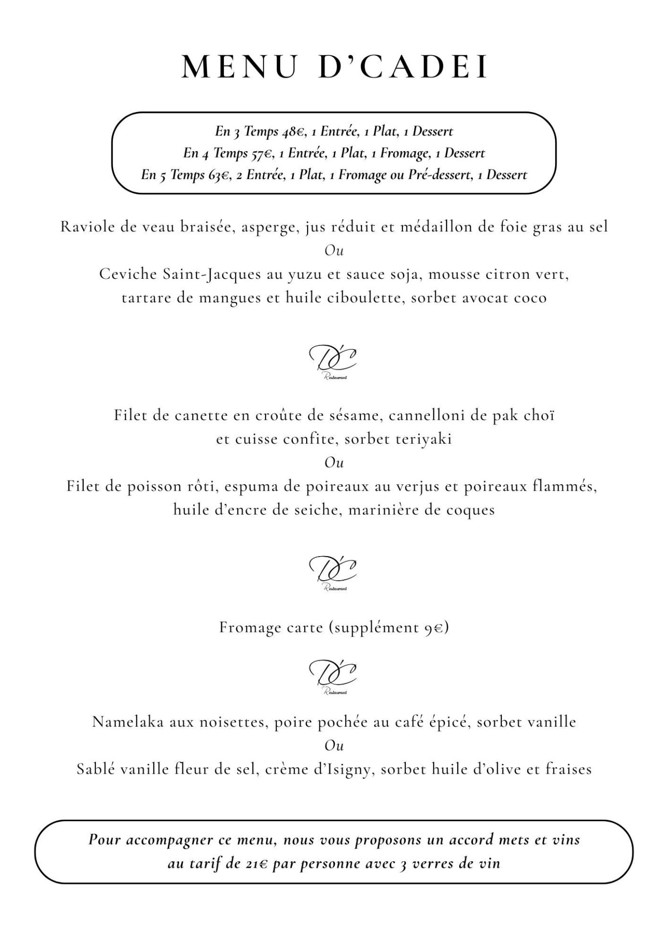 Nos menus sont réalisés à partir de produits frais. Il peut nous arriver de les adapter en fonction des arrivages du jour. Pour accompagner ces menus, nous avons le plaisir de vous proposer des accords mets et vins au gré de nos rencontres avec des viticulteurs que nous apprécions.