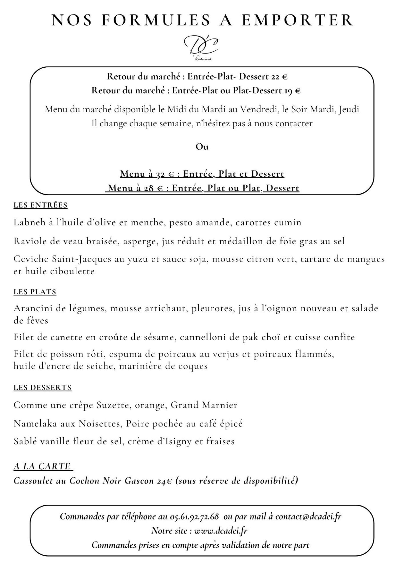 Envie de déguster la cuisine du D'Cadei chez vous ? Nous vous proposons nos formules à emporter :